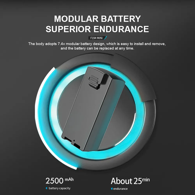 باتری که در کوادکوپتر F194 استفاده شده است ، یک باتری لیتیومی با ظرفیت 2500 میلی آمپر و با ولتاژ 7.4 ولت است که به شما این امکان را میدهد که به مدت زمان حدودی بین 18 تا 25 دقیقه به صورت مداوم از کوادکوپتر خود استفاده کنید.