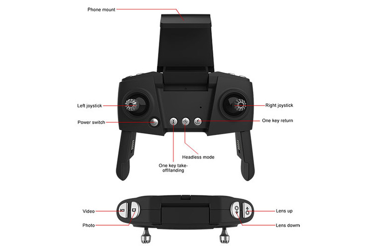 سایما دبلیو ۳، یک کنترلر مشکیرنگ دارد که بر روی آن دو جویاستیک، تعدادی دکمه کنترلی و محل قراردادن گوشی هوشمند دیده میشود. با استفاده از این کنترلکننده رادیویی میتوانید با کمترین دردسر، کوادکوپتر خود را به هر طرف که خواستید هدایت کنید. از دکمههای کاربردی روی کنترلر کوادکوپتر SYMA W3، میتوان به دکمههای تنظیم لنز دوربین، دکمه بازگشت به خانه، دکمه حالت Headless، دکمههای عکسبرداری و فیلمبرداری و … اشاره کرد